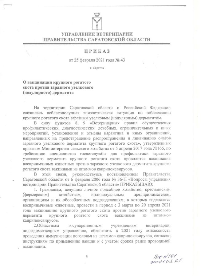 Приказ о вакцинации крупного рогатого скота